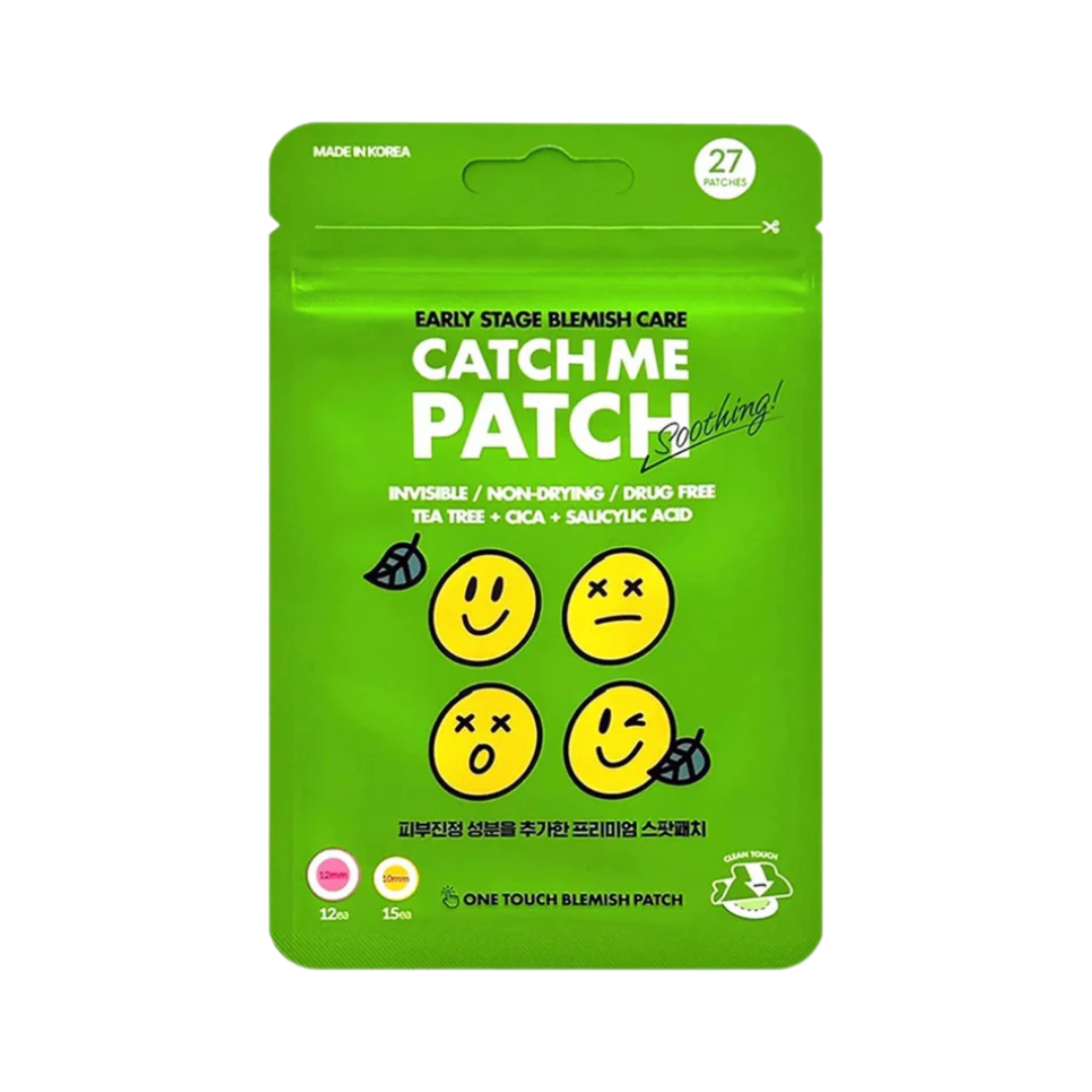 Catch Me Patch Soothing Spot Pouch 27pcs : hydrocolloid spot patches that absorb impurities, protect blemishes from irritation, and speed up recovery while sitting comfortably on the skin. Designed to be thin, discreet, and effective—perfect for calming active spots day or night.
