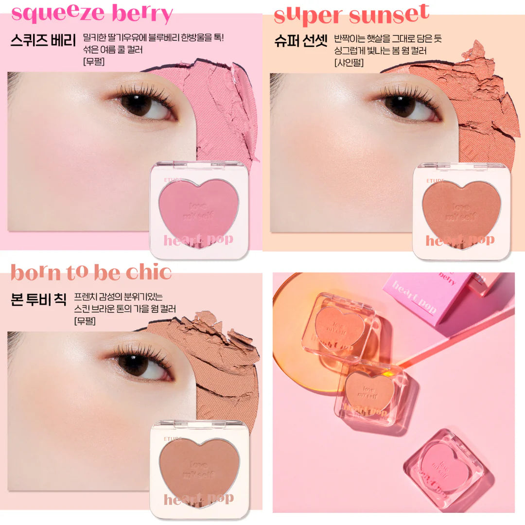 A silky, heart-shaped powder blush that blends effortlessly onto the skin for a natural, radiant finish. Its finely milled texture allows for buildable color—from a subtle flush to a vibrant pop—while maintaining a smooth, airy feel. Designed with adorable heart packaging that brightens both your cheeks and your mood.