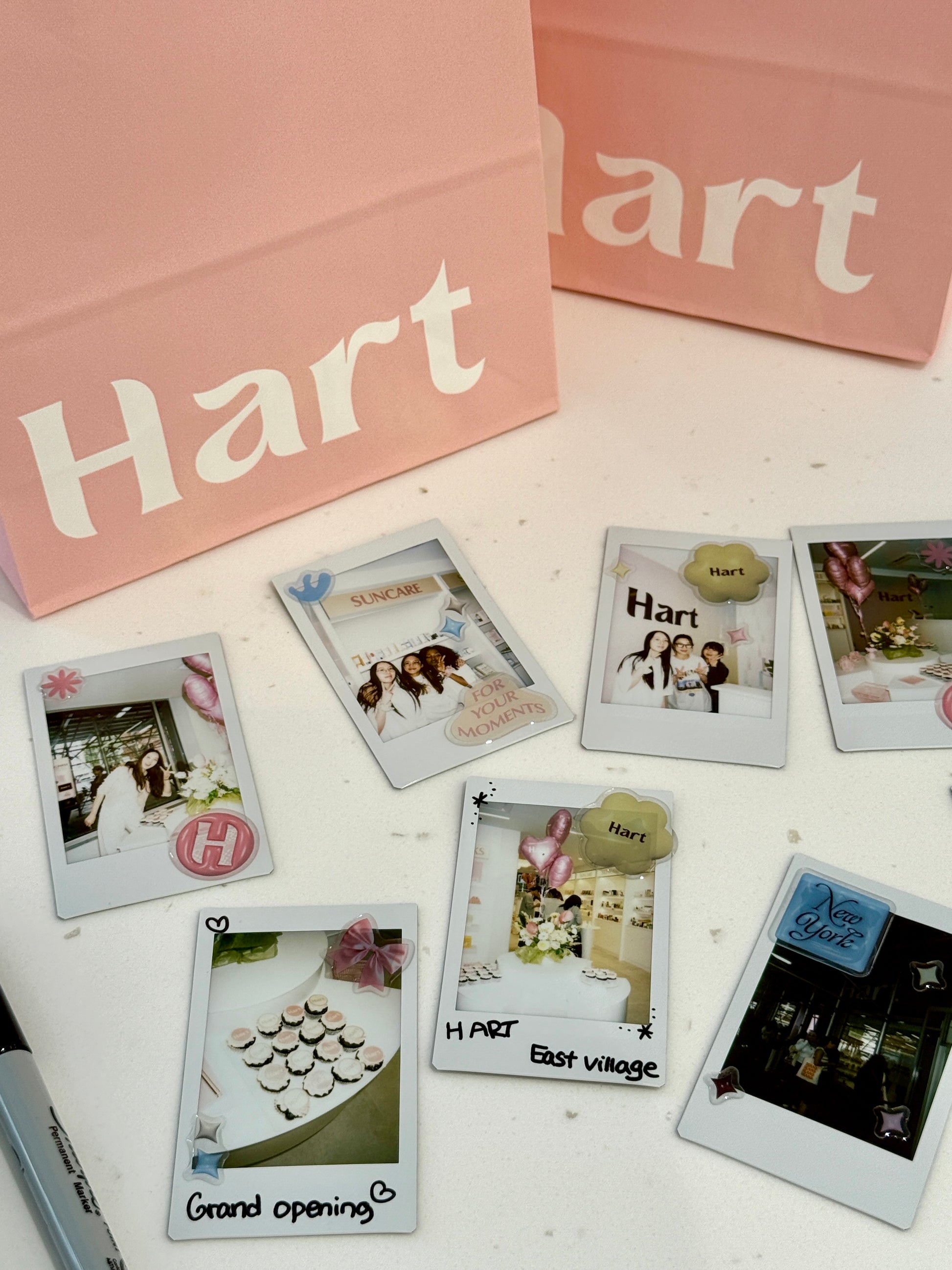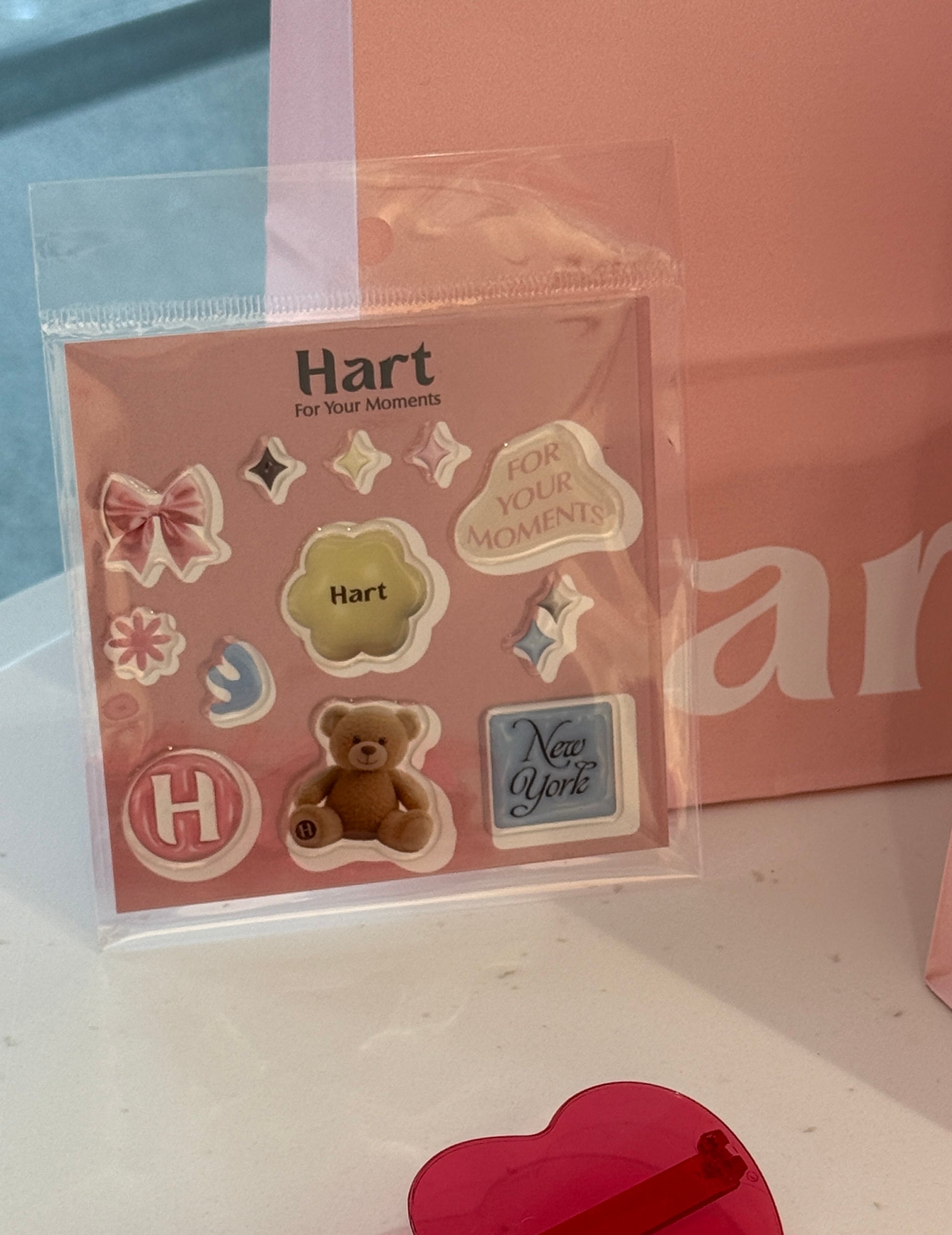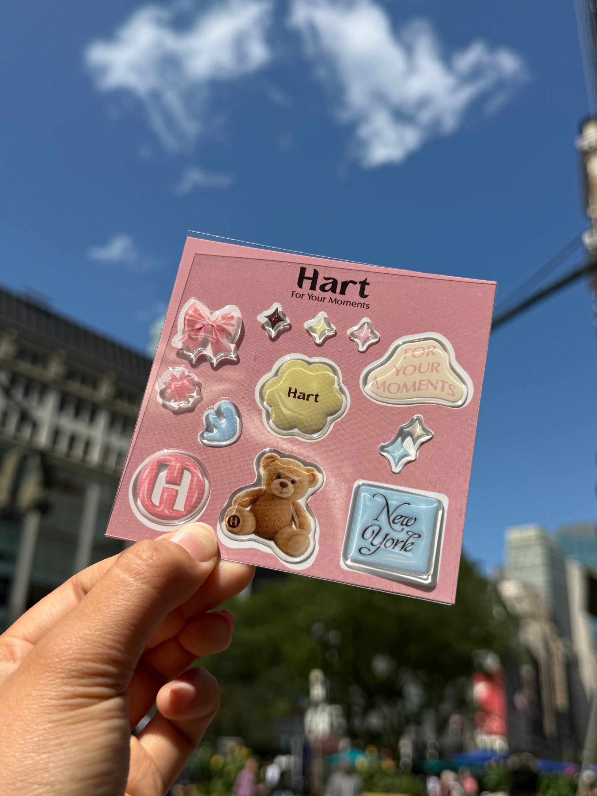 Bring charm and nostalgia to your everyday with Hart’s “For Your Moments” sticker collection. Designed with a soft pink backdrop and glossy finish, this set features signature icons—from the cozy teddy bear and ribbon bow to New York’s dreamy blue square. Perfect for decorating your phone, laptop, journals, or gift packaging.